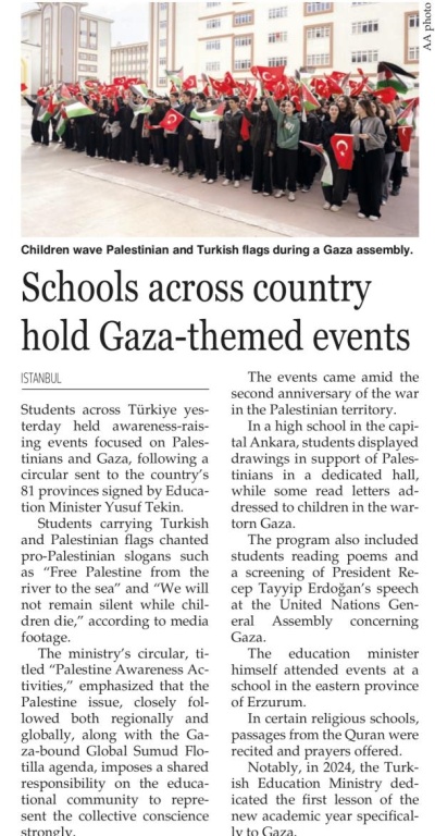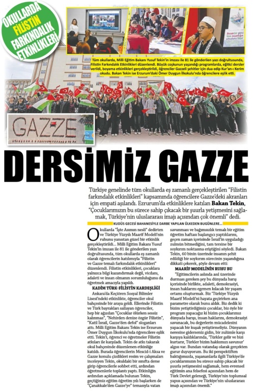 Milli Eğitim Bakanı Yusuf Tekin’in talimatları doğrultusunda tüm okullarda düzenlenen “Filistin Farkındalık Etkinliği” kapsamında okulumuzda da çeşitli faaliyetler gerçekleştirildi. Canlı yayınlarla desteklenen etkinliğimiz basında yer alarak geniş yankı uyandırdı.
