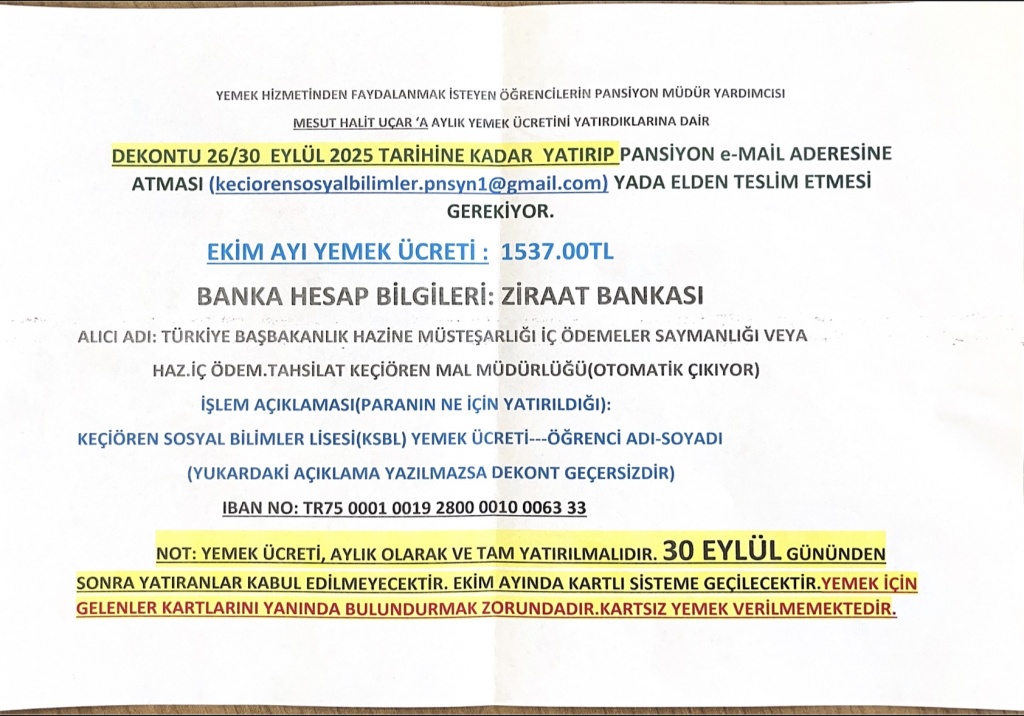 Ekim ayı yemekhane ücretlerinin belirtilen tarihe kadar ödenmesi gerekmektedir.